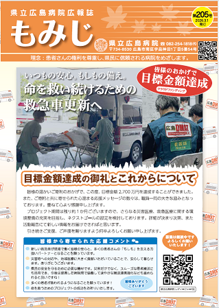 広報誌「もみじ」は、県立広島病院が発行している広報誌です。県立広島病院の催しや連携医療機関のご紹介など、患者さんや医療関係者に役立つ情報を毎月発信しています。当院にて無料で配布していますので、ぜひご覧ください。