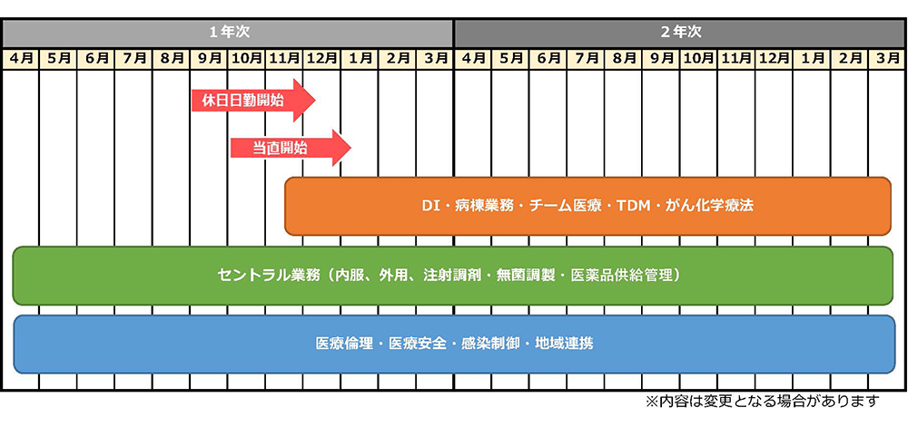 卒業後も安心して働けるよう,薬剤科全体で研修を受ける皆さんをしっかりサポートするプログラムとなっています。