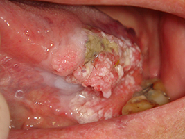 ほとんどの場合、初期は痛みを感じることが少ないか無痛の腫れです。潰瘍ができても口内炎と誤診されやすく、口内炎が治らないと訴えて受診されることも多いです。がんが大きくなるとコブ状の出来物となり、多くの場合潰瘍を伴って痛みが出てきます。