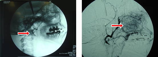 左:浅側頭動脈あるいは大腿動脈から外頸動脈を経て腫瘍の血管へカテーテル挿入し抗がん剤を注入