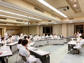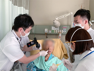 毎週月曜日にチーム回診及び介入中患者のカンファレンスを行っています。嚥下内視鏡検査は耳鼻科・頭頸部外科(月、水、金)歯科・口腔外科(火、木)が担当しています。嚥下造影検査は水、金に行っています。食事の摂食嚥下状態、栄養状態、口腔内の衛生状態、歯牙・義歯の状態の確認と評価を行います。評価に基づき必要な検査と適切な食事形態、嚥下訓練の指導を行います。積極的なケアやリハビリを行うことで食べる機能の回復と肺炎の予防に努めています。認定看護師と言語聴覚士は毎日嚥下回診を行い、病棟看護師とともに食事介助しながら、日々の摂食状況を確認しています。症例により栄養サポートチームと連携してケアを行っています。