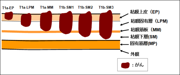 - T1b:がんが粘膜下層(SM)にとどまるもの