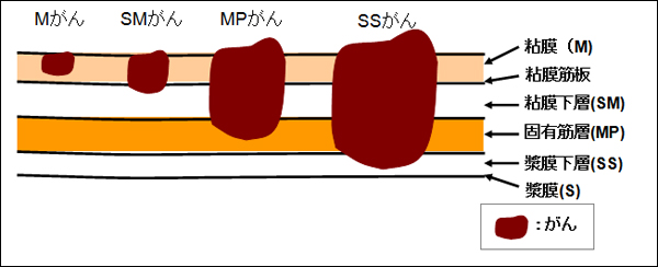 粘膜がん(Mがん)、粘膜下組織への軽度浸潤がん(SMがん)。