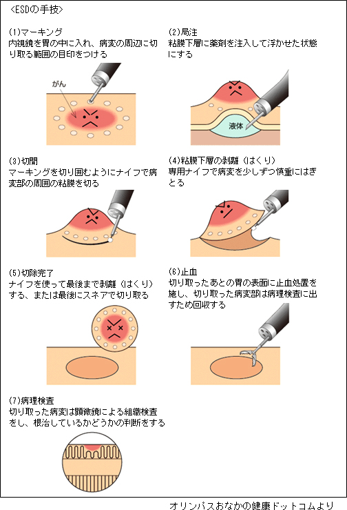 食道がん、胃がんでは内視鏡的粘膜下層剥離術(ESD)が治療の一般的な方法です。ESD(図3)は、がんの周囲に印(マーキング)を付けます。がんの下部の粘膜下層にヒアルロン酸や生理食塩水を注入しがんを浮き上がらせ、周辺を切開します。切開した部位からがんの下部の粘膜下層を剥いで行き、病変全体を切除します。がんを切除してできたきずあと(潰瘍)にある血管の止血処置を行います。切除病変を回収し、病理医が顕微鏡で診断(病理診断)を行います。