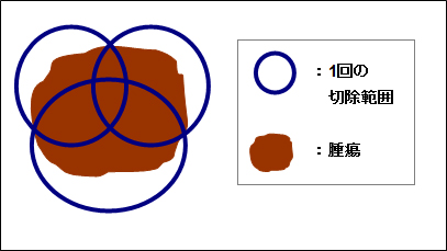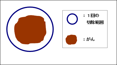 がんの内視鏡治療の原則は一括切除(図5、図6参照)です。EMRもESDも一括切除ができますが、切除できる大きさに差があります。EMRはスネアの大きさで切除できる病変の大きさが決まります。一般的には大きさ2cmまでの腫瘍の一括切除が可能です。ESDは周辺切開を行い、粘膜下層を剥離しますので2cm以上の病変でも一括切除ができます。治療時間はEMRがESDに比べ短時間で済みます。