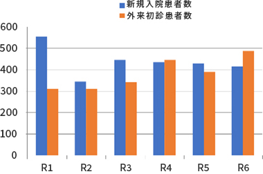 - 令和6(2024)年度の外来患者数は月平均1,002人(R6/4~R7/3)、延べ入院患者数5,875人、新規入院患者416人、逆紹介率188.1%。(1)腎生検、(2)CKD教育入院、(3)シャントPTA(経皮的血管拡張術)を積極的に受け入れています。