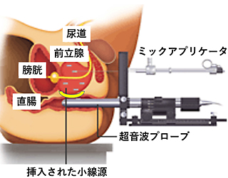 小さな線源を前立腺内に挿入し、前立腺内のがん病巣へ線源から放射線を照射する放射線治療です。