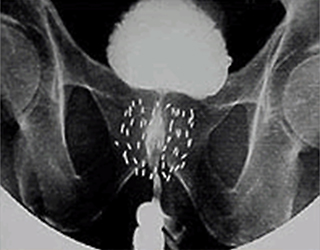 前立腺に挿入された線源のレントゲン