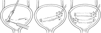 Deflux®を尿管口の内側(壁内尿管)や尿管の出口付近の6時に注入し、支持組織を強固にし、広く開いた口を狭められるようにします。