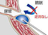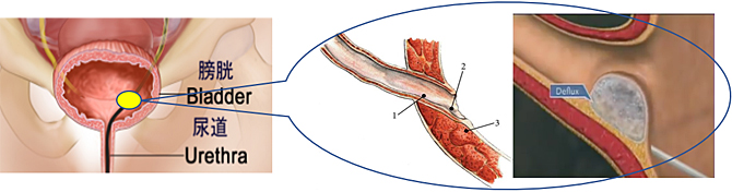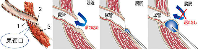 尿管が膀胱壁をつらぬく部位(膀胱尿管移行部)の逆流防止のしくみが弱いために発生するため、Deflux®で尿管口の支持組織を強固にし、逆流防止のしくみを強くすることで逆流を防ぎます。
