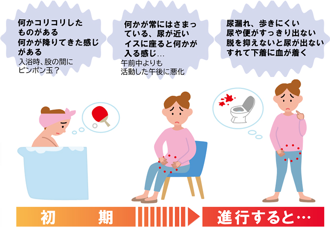下腹部や膣の中に、‘何か’が降りてきたような違和感、会陰部に‘何か’触れる、歩行や排便時など腹圧がかかった時の下垂感、不快感、立っていると頻尿になり、トイレに間に合わなくなるなどあります。