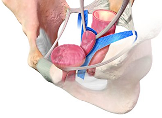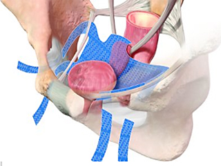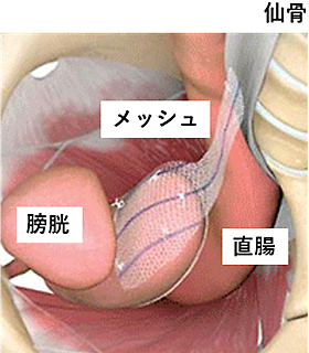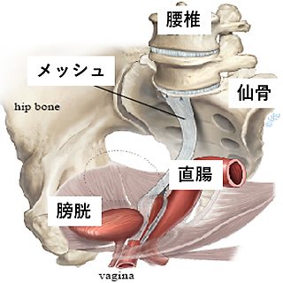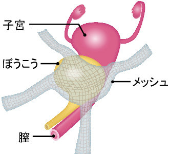骨盤臓器脱の原因は支持する靱帯、筋膜、筋肉が弱くなることであり、それらを補強することが本来の治療です。当院ではメッシュを使用した腹腔鏡下仙骨膣固定術(LSC手術)と経膣的メッシュ手術(TVM手術)を行っています。