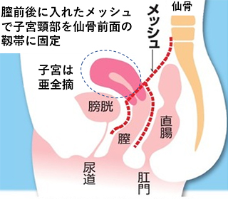 子宮頸部を残して子宮を亜全摘し(子宮膣上部切断術)、メッシュで残存させた子宮頸部を仙骨前面の靱帯に固定させる最新の手術です。本邦でも2014年4月から保険適応となりました。