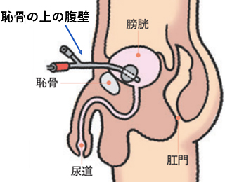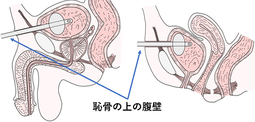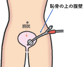 • ベッドの上に仰向けに寝た姿勢(仰臥位)で、恥骨の1~2cm上の腹壁から腹部超音波(エコー)で膀胱を確認し、腹壁から直接、細い針を膀胱へ刺し、尿を出すための管(膀胱ろうカテーテル)を膀胱内に留置します。