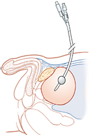 通常、尿道から尿を出すための管(尿道カテーテル)を留置します。しかし、それが難しい場合(尿道狭窄や尿道断裂、尿道カテーテル交換困難、膀胱タンポナーデ)や長期間にわたり管の留置が必要となる場合、膀胱ろうを造設して尿を出すための管(膀胱ろうカテーテル)を恥骨の上の腹壁から直接、膀胱内に挿入する本検査・治療の適応となります。