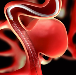 非常に網目の細かい金属メッシュのステント【図1】を、脳動脈瘤の入り口を覆うように血管の中に留置します。それによって脳動脈瘤内への血液の流入が減ることにより、脳動脈瘤内の血液が血栓化して、脳動脈瘤そのものを縮小させてしまう方法です【図2】。