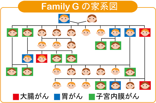 下図は19世紀初頭に報告されたFamily Gというがん家系でリンチ症候群という疾患概念が確立される契機になった家系図の一つですが、一見するだけで3つのがんが家系内に多発していることが分かります。