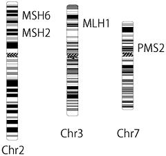 大腸がんは基本的には自覚症状はありません。早期がんでは全く自覚症状がないといっても過言ではありません。進行大腸がんではその程度によって血便・腹痛・便秘・腹部膨満感などを自覚することがあります。大腸がんを発見するリンチ症候群の原因は、遺伝情報を含む染色体の中にあるMLH1、MSH2、MSH6、PMS2といったミスマッチ修復遺伝子の病的変異です。これらの病的変異を治す治療は今現在ありません。しかしながら、リンチ症候群と診断された家系の方々にリンチ症候群に発症する関連がんの検診(推奨方法はリンチ症候群のサーベイランス〔表2〕)を行うことで、早期のがん発見・低侵襲でがんを治す治療の提供が可能となります。
