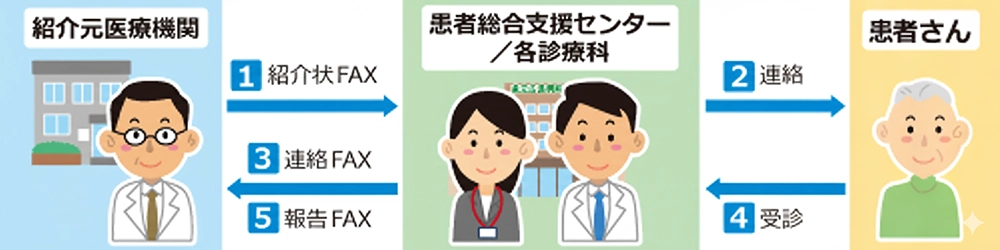 患者紹介状(診療情報提供書)を、患者総合支援センター(地域連携室 紹介予約担当)へFAXでお送りください。(受診時にカルテが用意できます)
