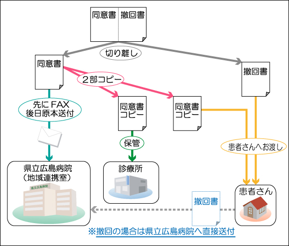 ※同意書・同意撤回書は必要事項を記入の上、切取線で切離し、撤回書は患者さんにお渡しください。同意書の原本別途、県立広島病院地域連携室へ送付してください。