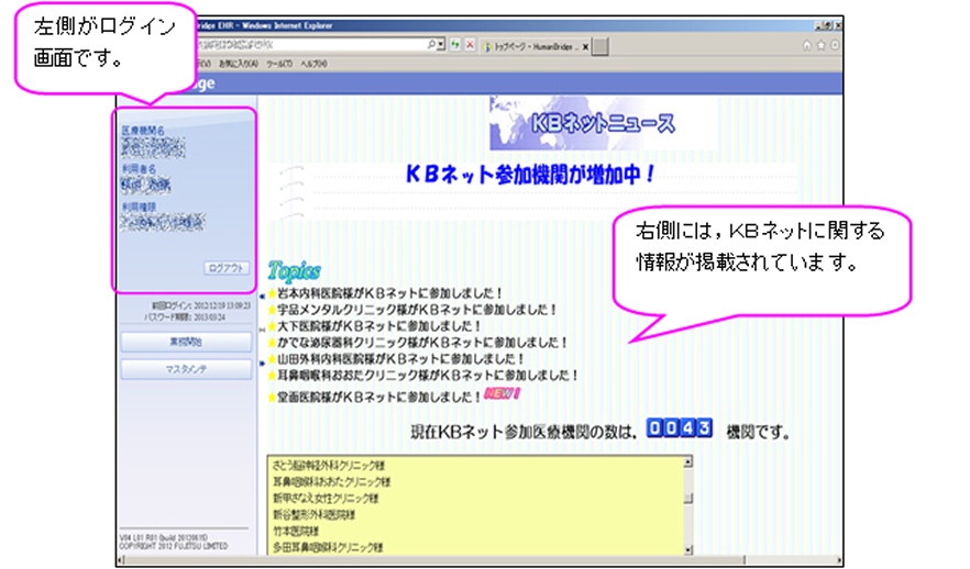 ここではKBネットに関する様々な情報(参加診療機関、メンテナンス情報など)を見ることができます。