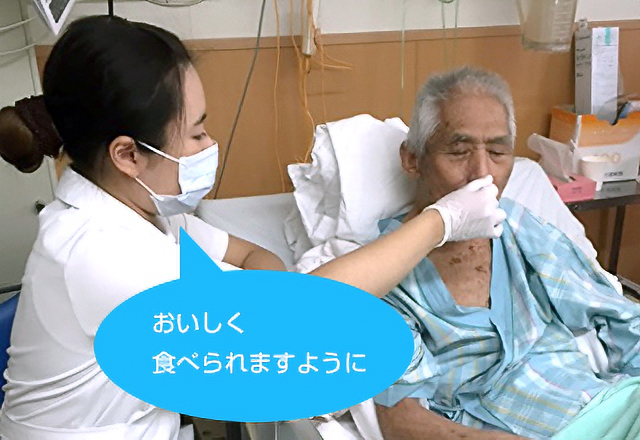患者さんのベッドサイドをまわり、食べやすい食形態、食事時の姿勢、食べるコツなどを多職種(医師、歯科医師、リハビリ、栄養士、薬剤師、看護師)とともに検討し、より良い方法を考え、病棟看護師とともにケアの実践をしています。
